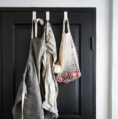 Hangs over the top edge of the door and helps you convert unused space into a storage place for bathrobes and bags.